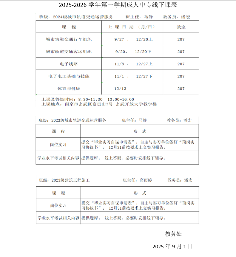 2025-2026学年第一学期成人中专线下课表